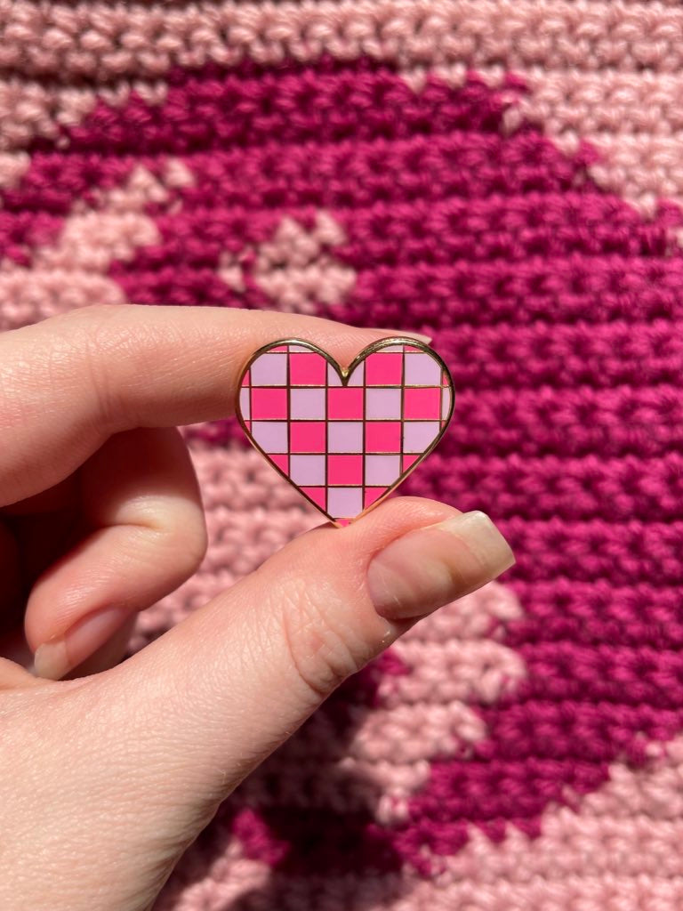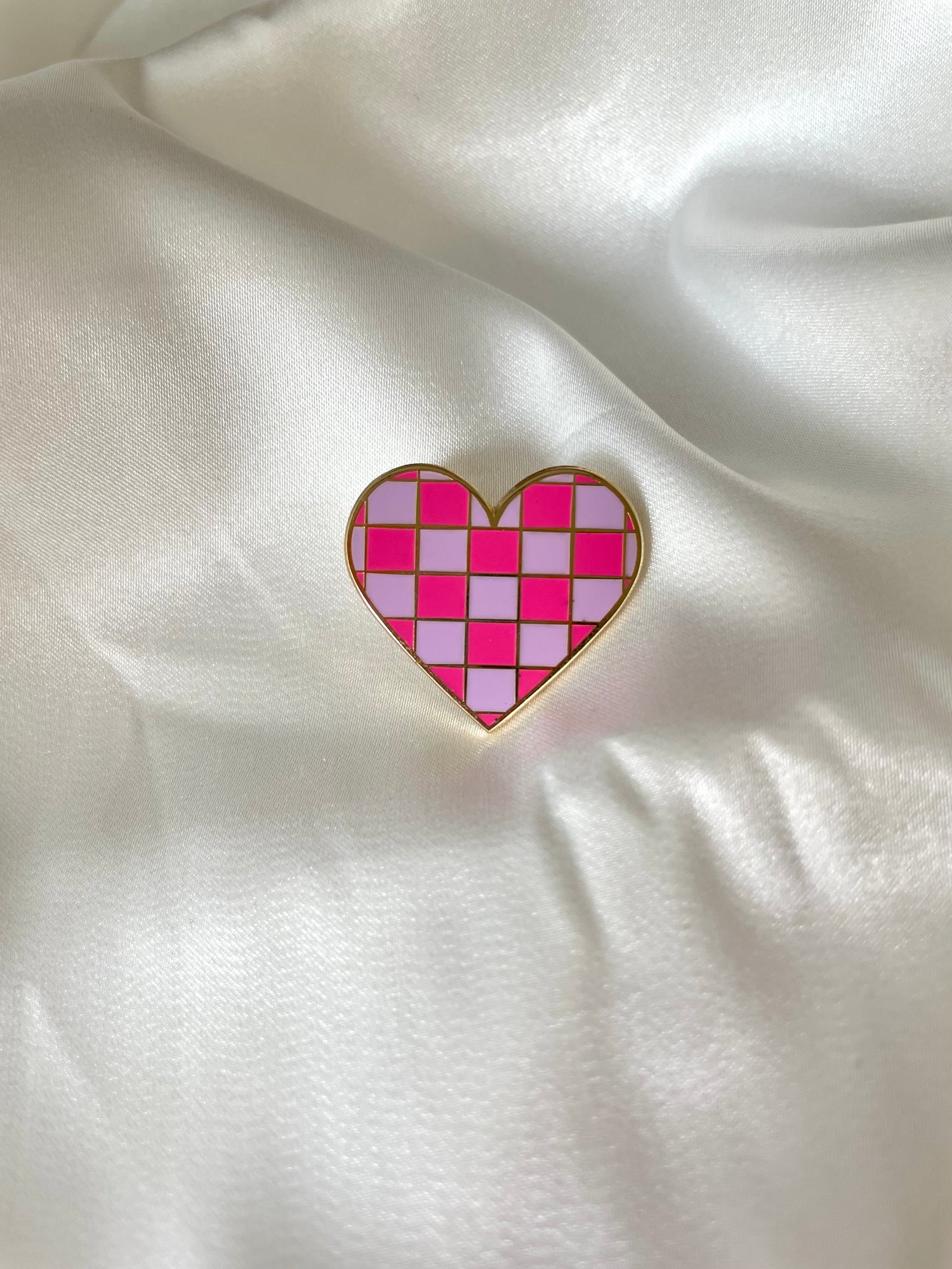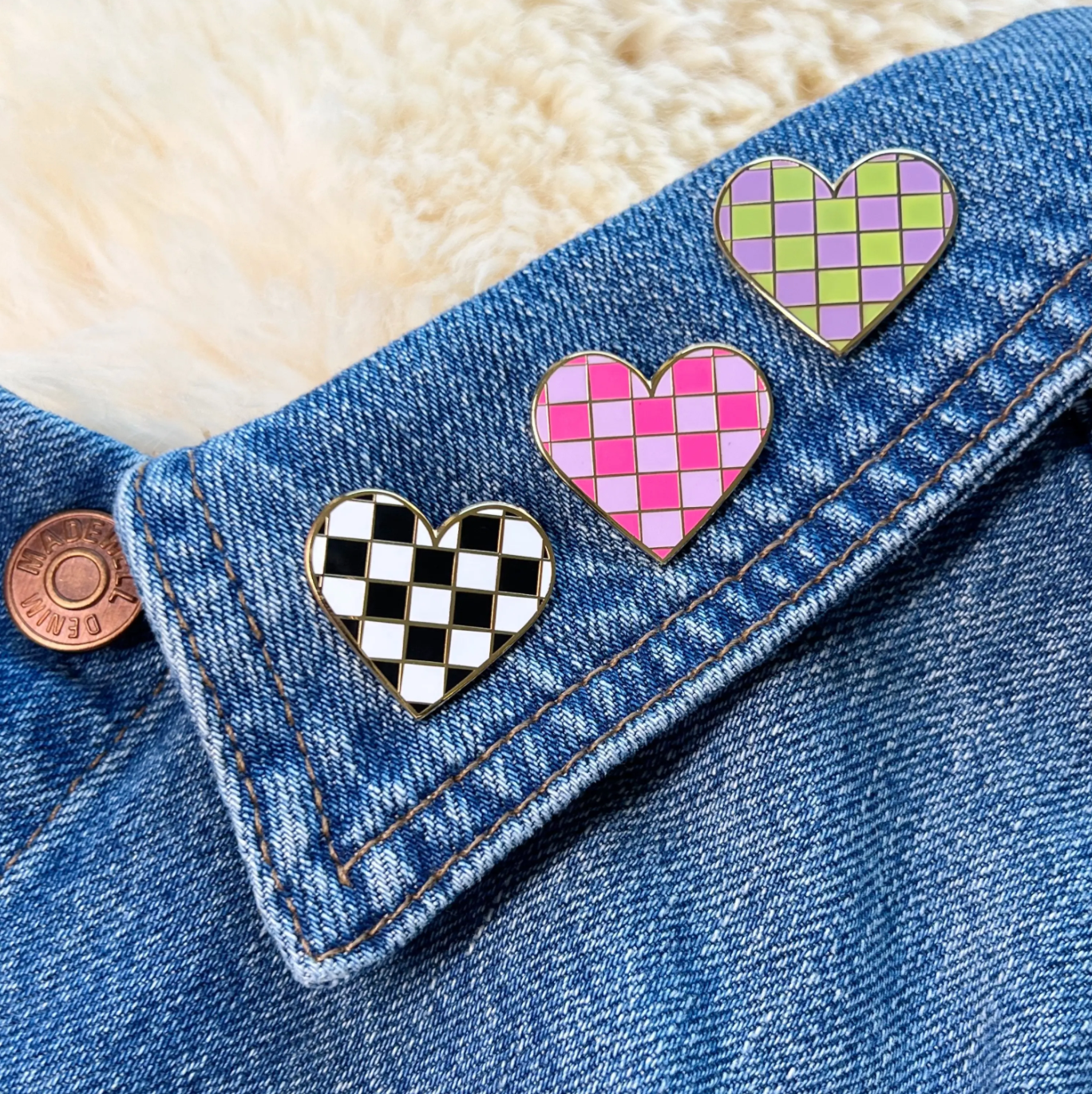 add some vibes to your pin collection with a checkered heart enamel pin! fun little gift for friends (or yourself!). hard enamel detailed in gold.
