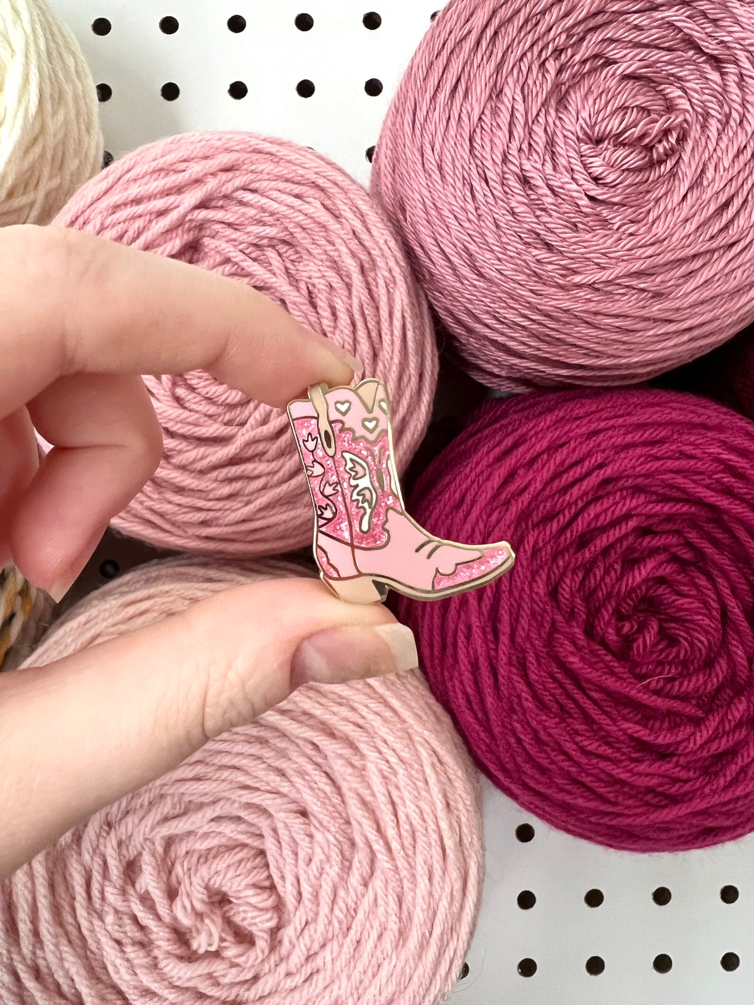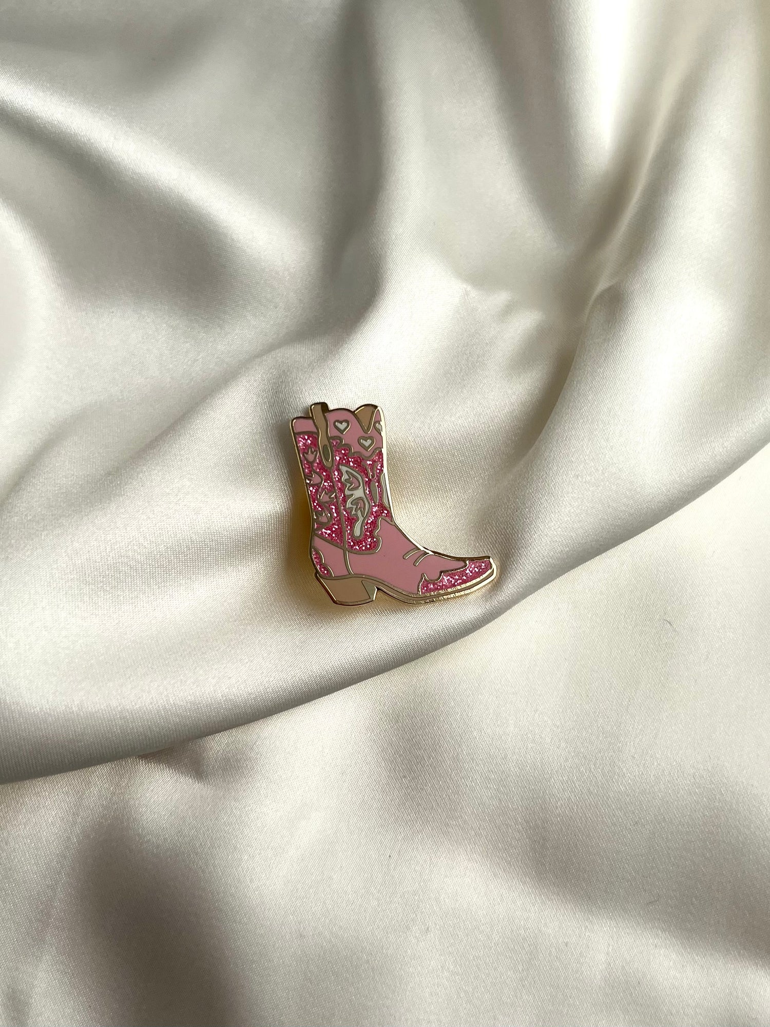 perfect for space cowgirl - disco cowgirl themes & southern bachelorette parties (howdy Nashville, Austin!)! cute cowboy boot pin in bright pink glitter & gold enamel with a butterfly motif.