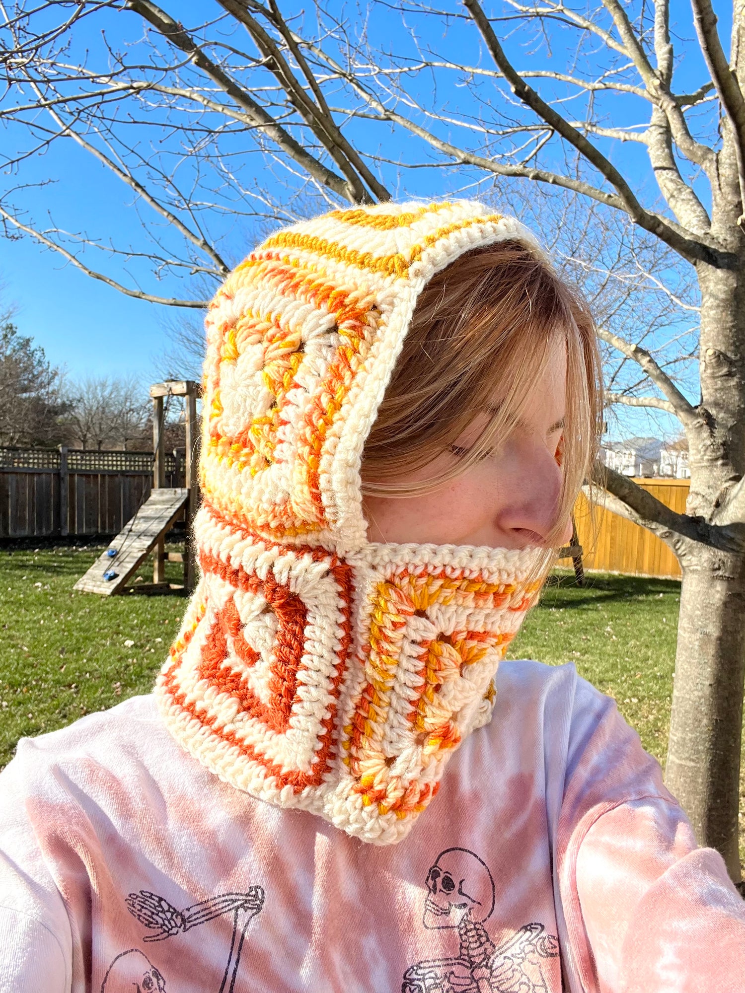 hand crocheted balaclava in lovely orange and yellow hues, reminds me of a dreamsicle!