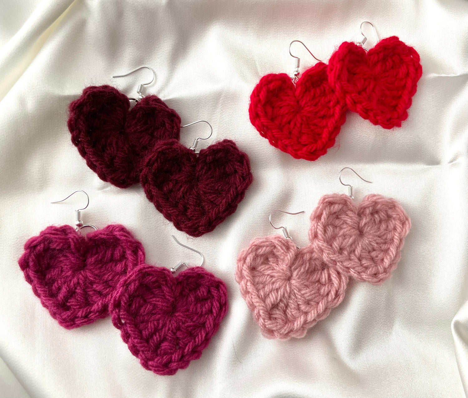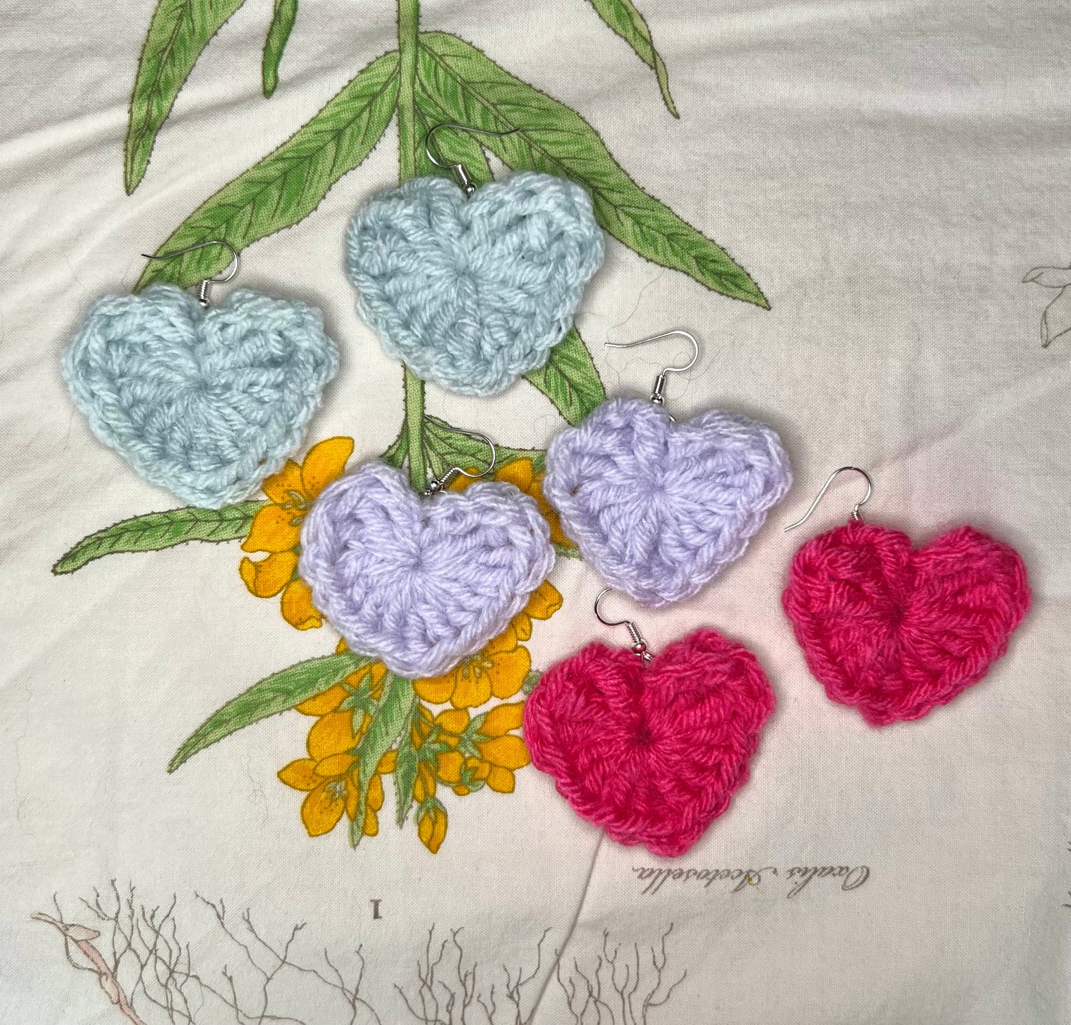 dangly hand crochet heart earrings, a perfect accessory for valentine’s day!