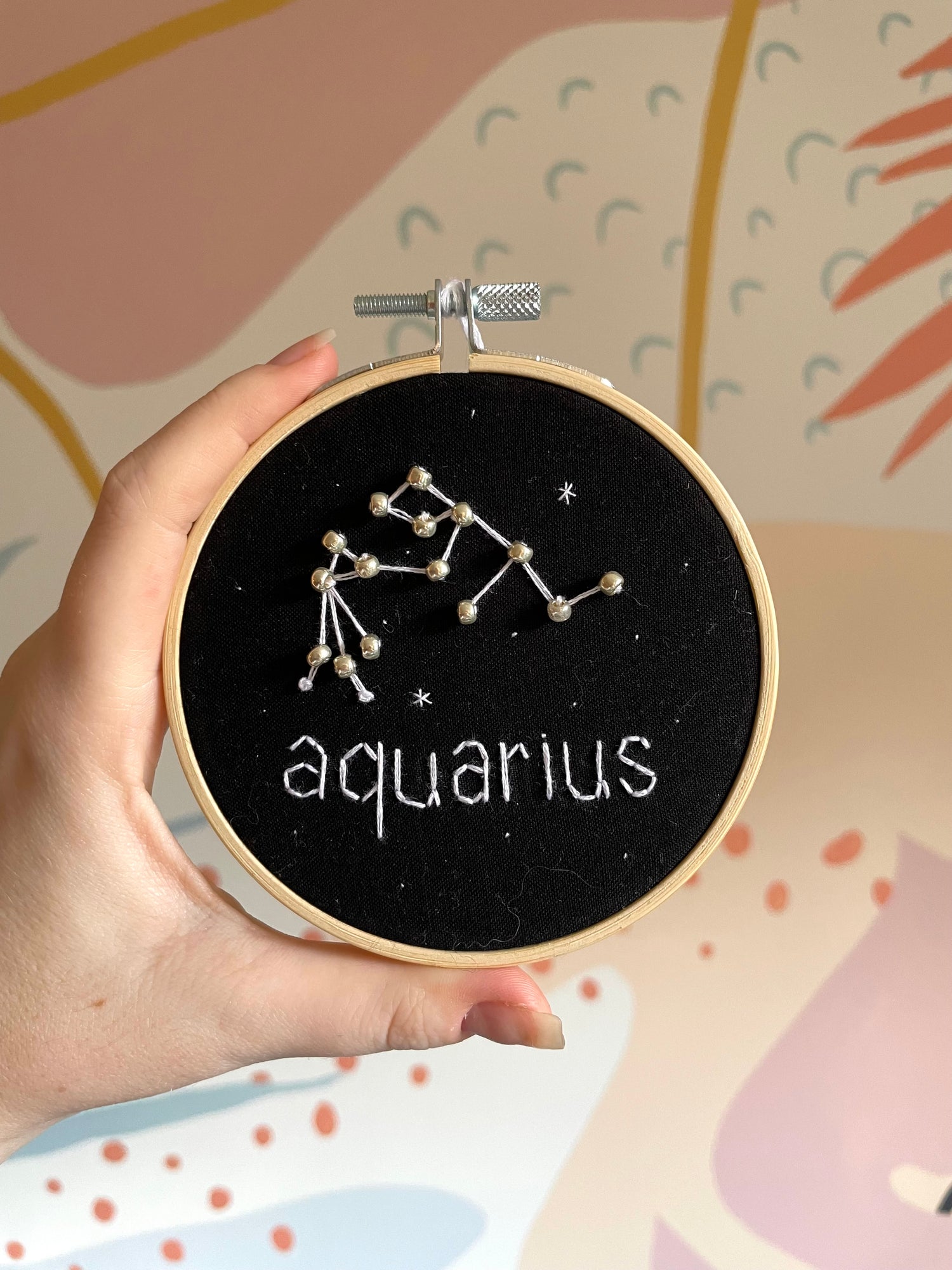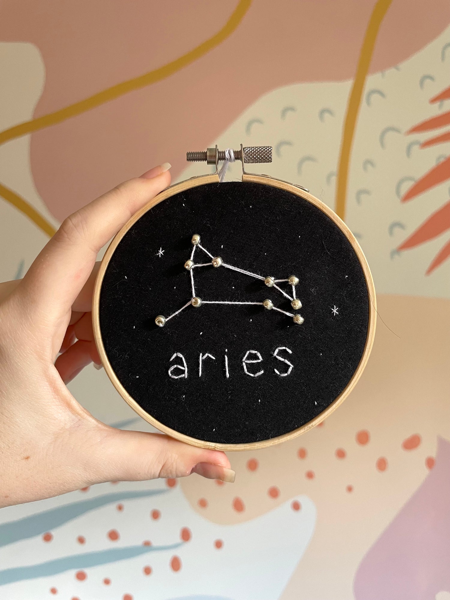 these are handmade so there are slight differences in each hoop but the constellation and sign will always be on there! comes with a small loop to hang it from and the back is covered with felt