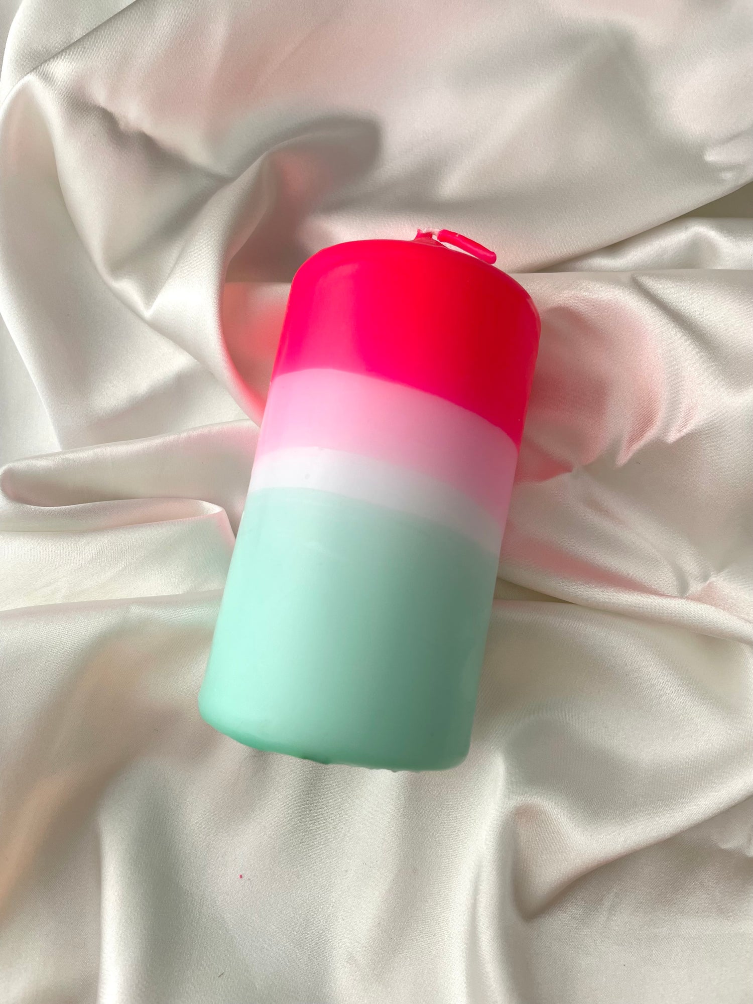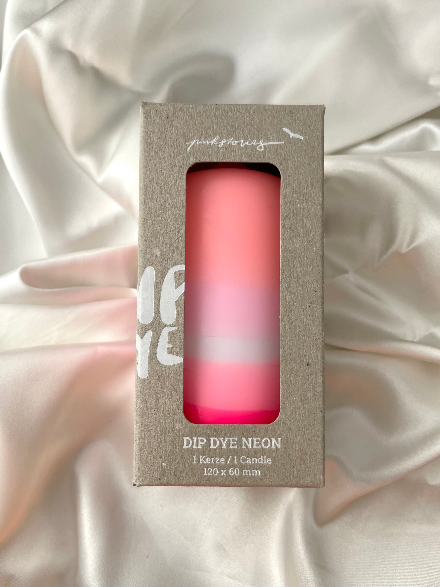 a lovingly hand-dyed pillar candle in neon coloring. each style's colors remain the same, but the patterns will vary for each candle making them unique.