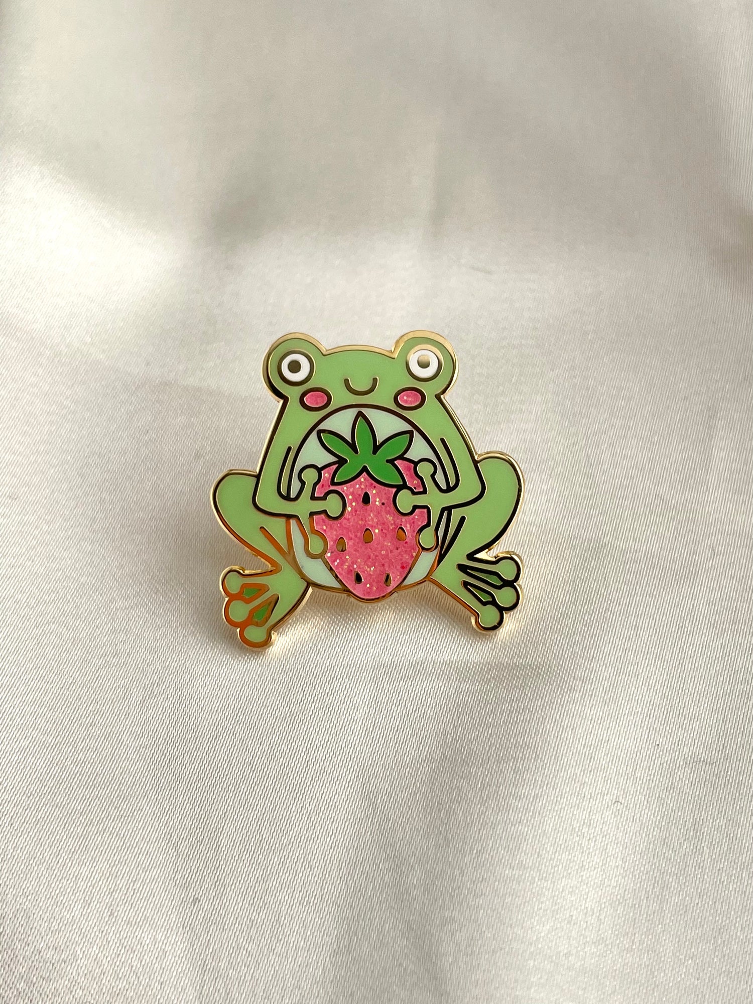 cute frog & strawberry enamel pin bc everyone needs an adorable frog pal! add a little sweetness with this frog holding a prized, glitter strawberry! makes the perfect gift for friends (& self gifts too :))!