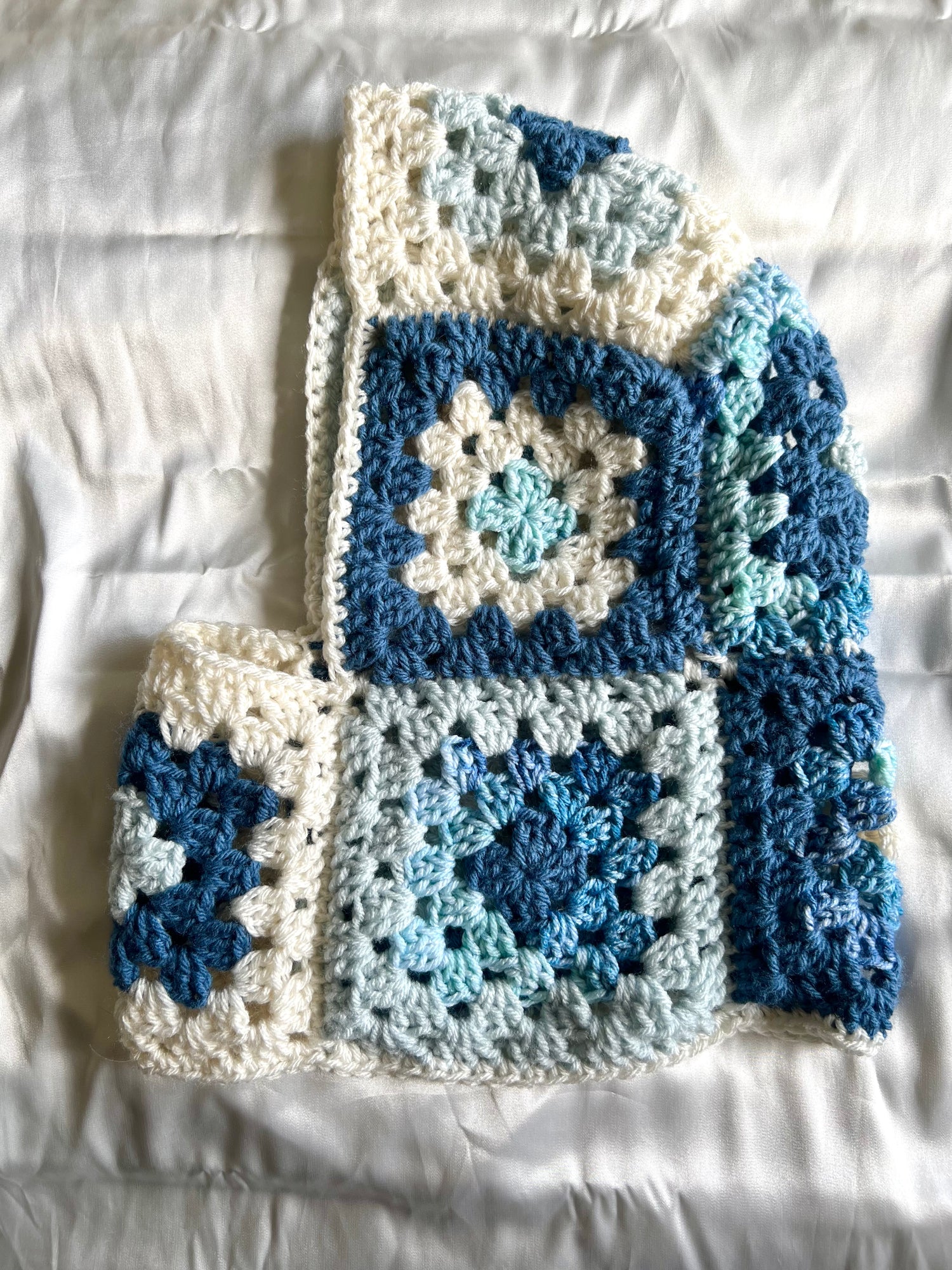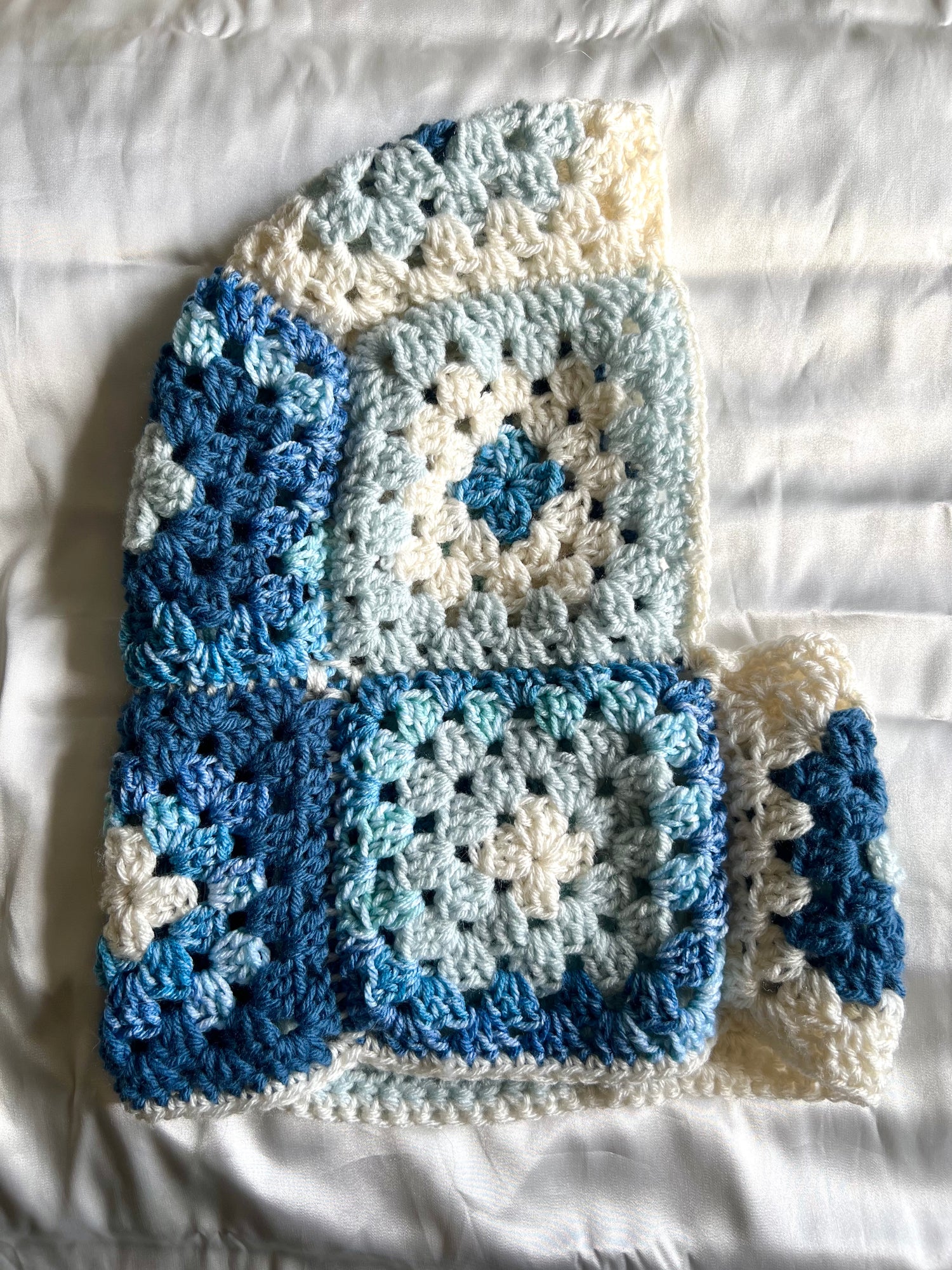 hand crocheted balaclava in white and blue tones, perfect winter vibes!