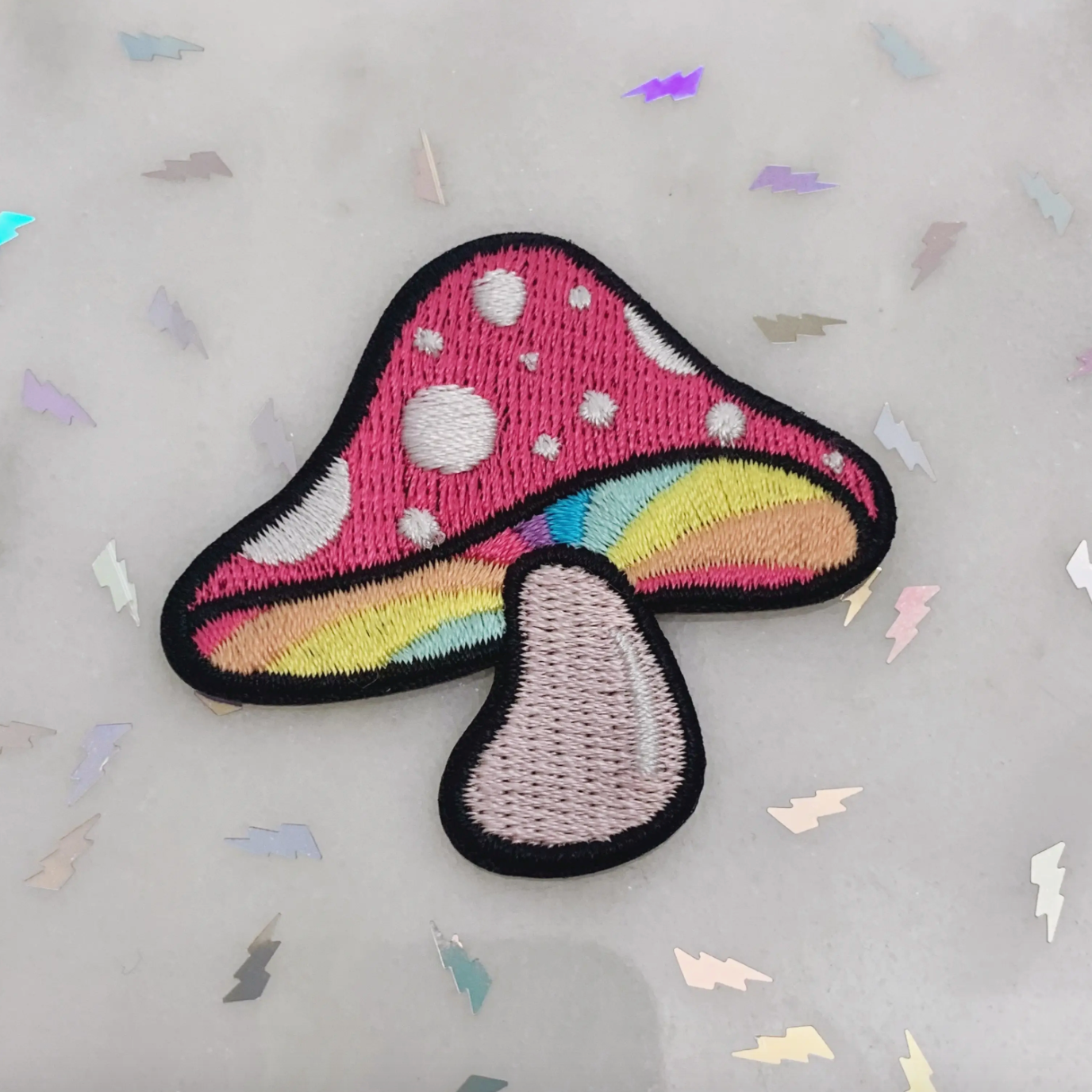 feelin' groovy with this magic mushroom patch! inspired by retro 70s styling but updated with a cute pink cap & trippy rainbow detailing!