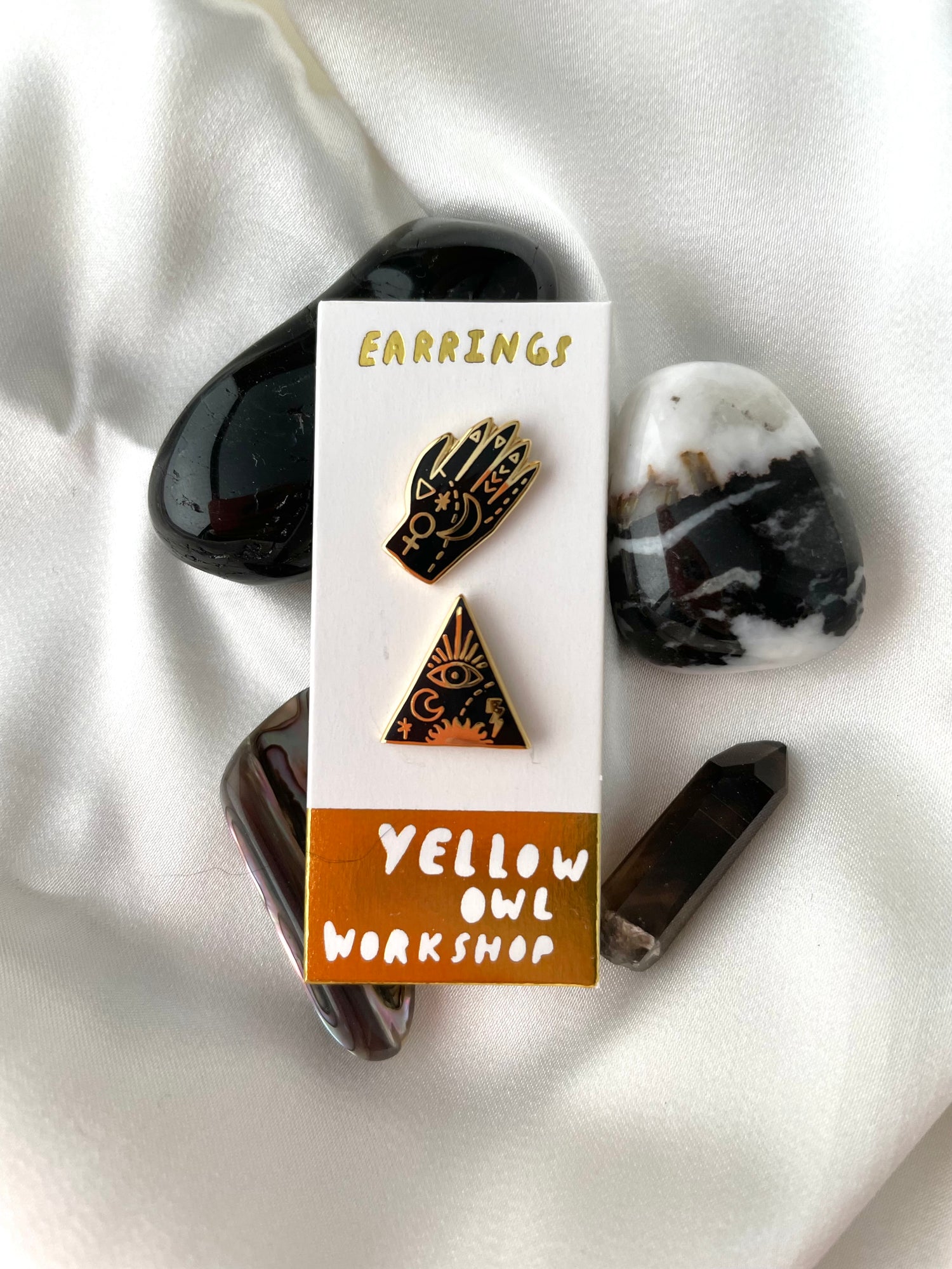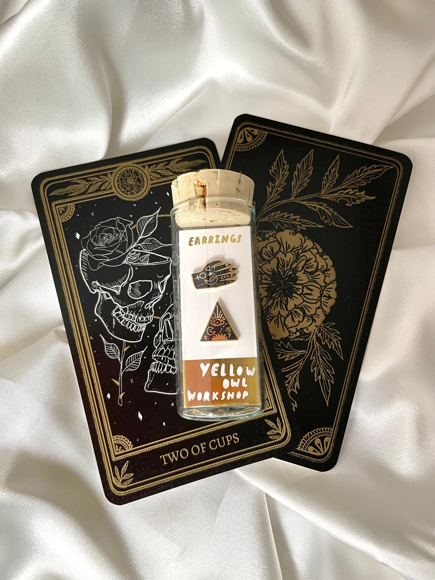 presented in glass vial packaging, these unique earrings blend a sense of gold glamour with a charming twist. the mismatched yet perfectly paired cloisonné petite studs are gilded in 22 karat gold and have hypoallergenic posts.