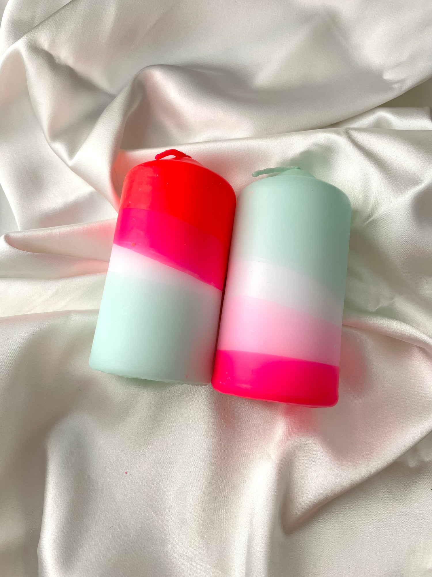 set of two lovingly hand-dyed pillar candles in neon coloring. each style's colors remain the same, but the patterns will vary for each candle making them unique.