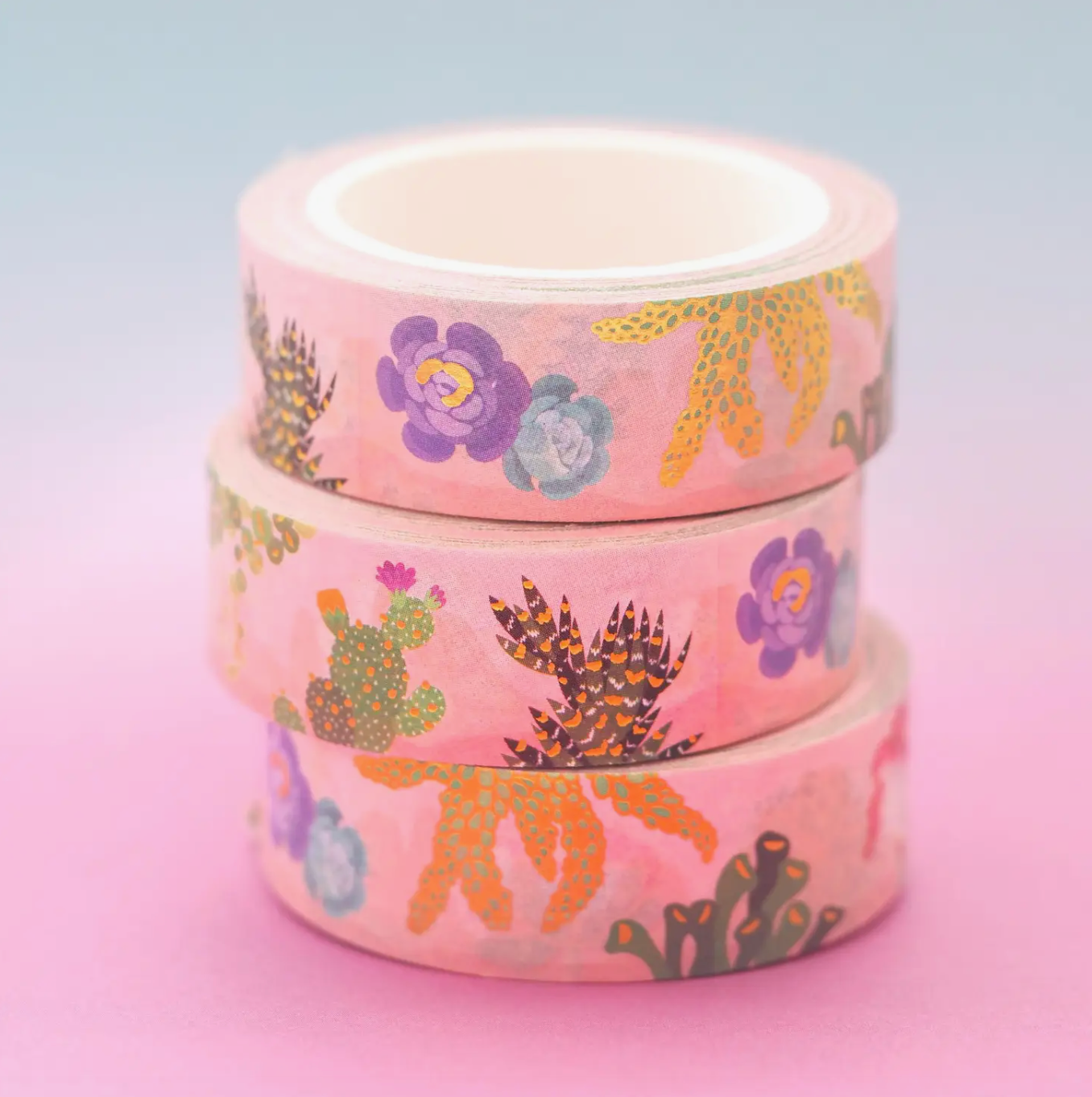 this cute washi tape features 14 of our favorite succulents and cacti: Echeveria, Sedum morganianum "burro tail", Crassula ovata "ogre ears", Euphorbia lactea cristata, Cotyledon tomentosa ladismithiensis "Bear's paw", Aporocactus flagelliformis "rattail", Aloe brevifolia, Lithops, Epiphyllum anguliger "fishbone cactus", Kalanchoe thyrsiflora "flapjack succulent", Aeonium variegated, Senecio rowleyanus "string-of-pearls", Opuntia "prickly pear", Haworthiopsis attenuata "zebra haworthia".