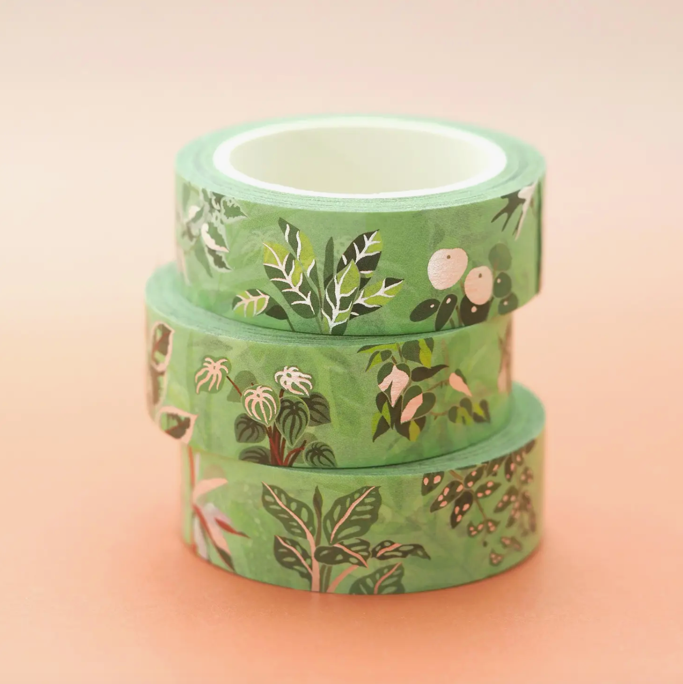 this cute washi tape features 12 of our favorite tropical houseplants: Ficus tineke, Peperomia argyreia "watermelon peperomia", Philodendron scandans brasil, Monstera deliciosa variegated, Begonia maculata, Philodendron Silvery Anne, Ctenanthe lubbersiana, Pilea peperomioides, Staghorn fern, Stromanthe triostar, Monstera adansonii, Hoya krinkle8.